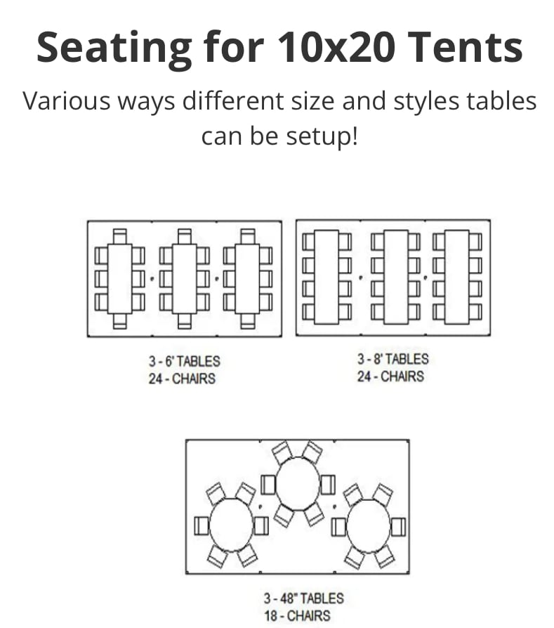 This package includes enough shade and seating for a LARGER sized function. (up to 54 guest). Perfect for parks, parking lots or yards with lots of space but in need of shade. The canopies can be setup side by side (30x20) or stand alone (10x20) from one another which adds versatility to your event layout.